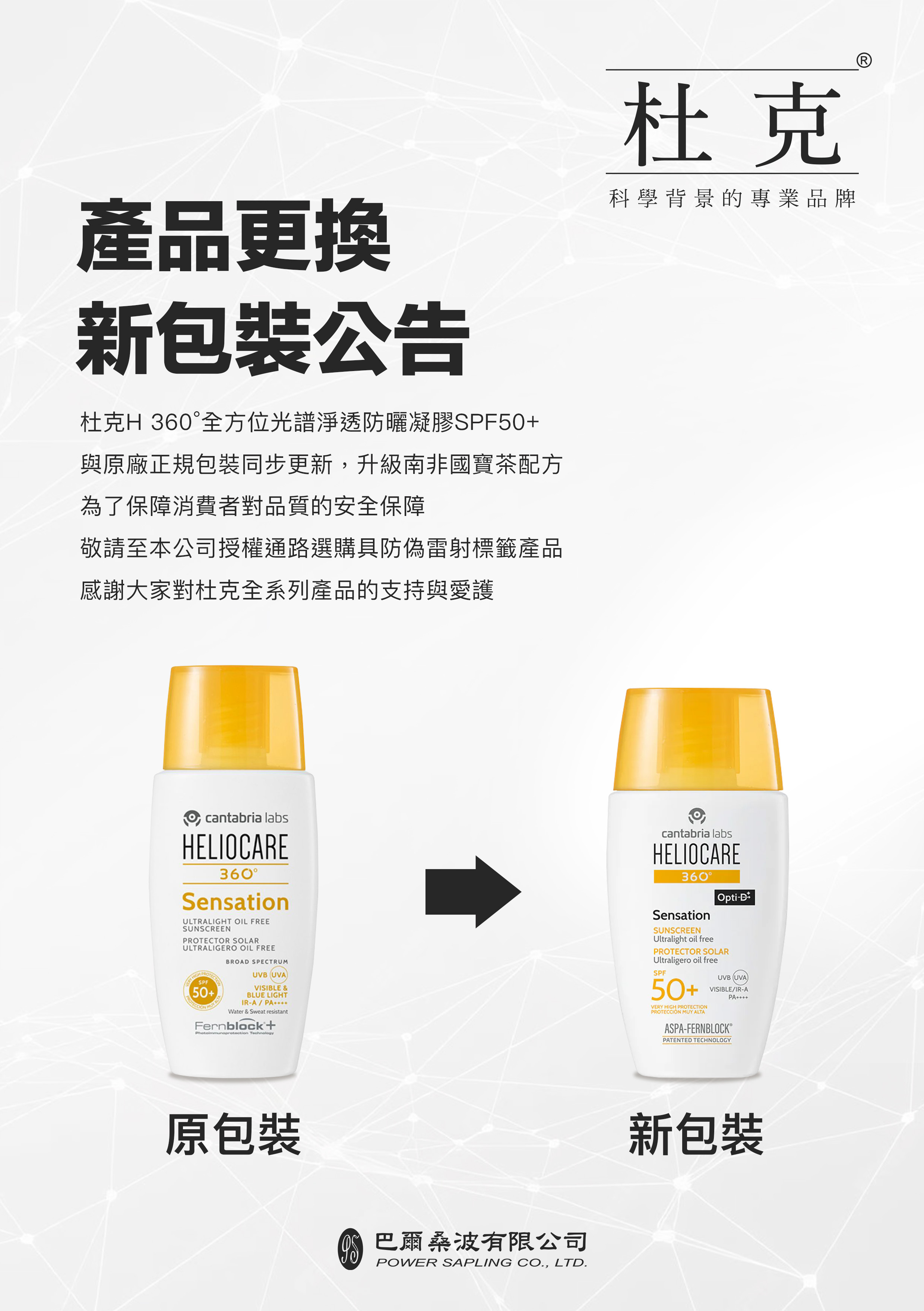 產品更新包裝公告 ! 杜克H 360°全方位光譜淨透防曬凝膠SPF50+